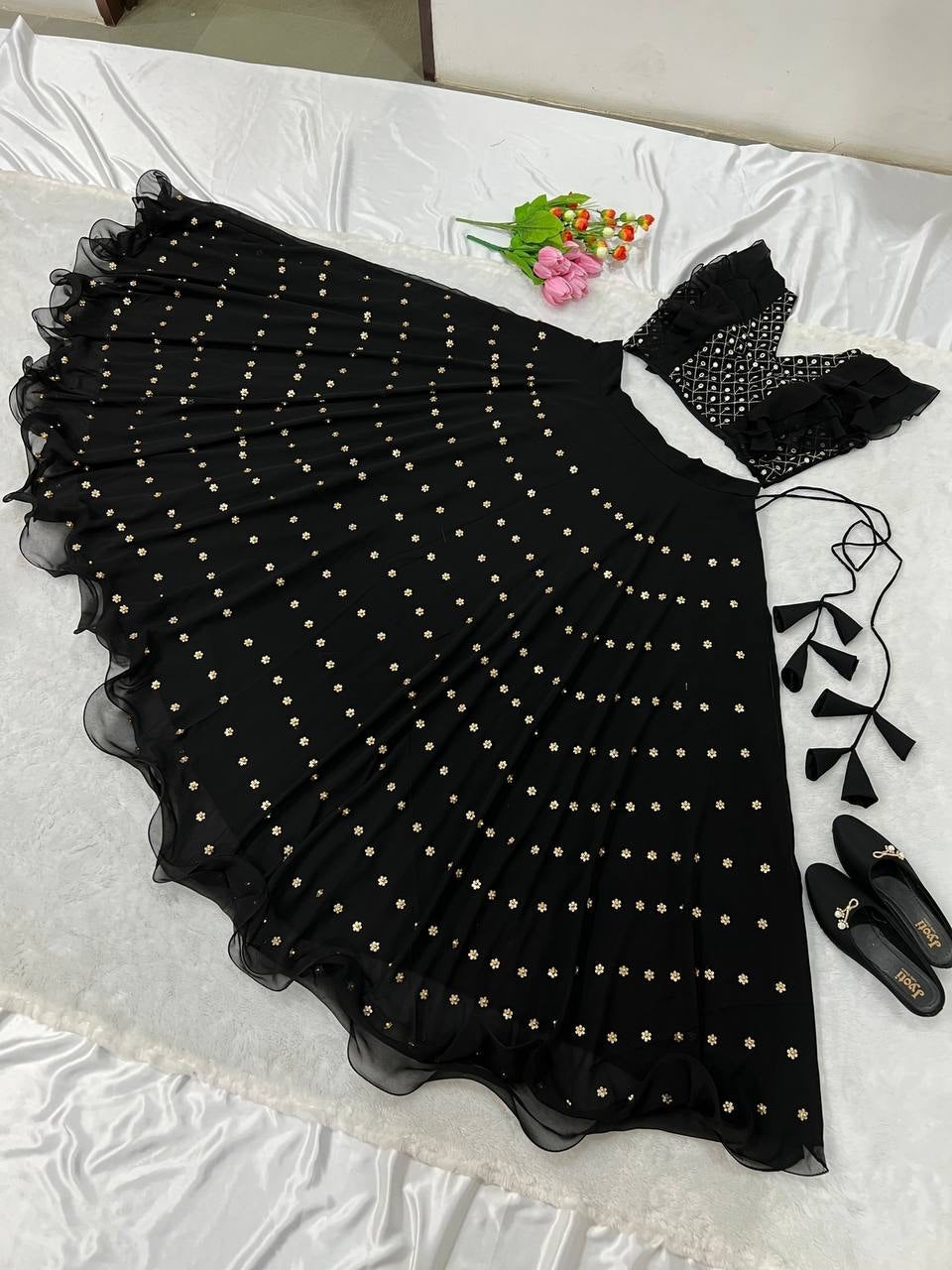 Dark Black Faux Georgette Moti Work Lehenga Choli