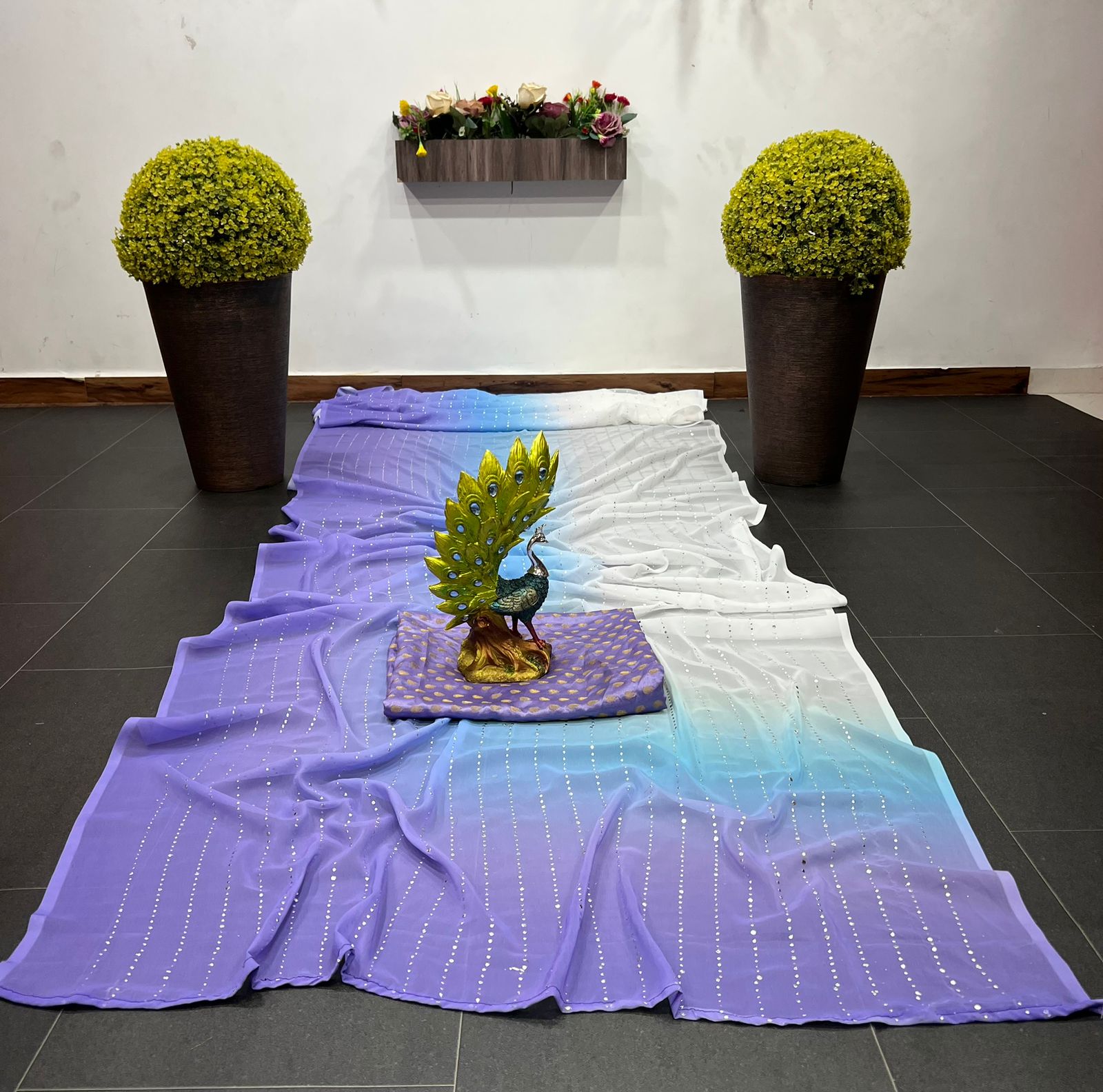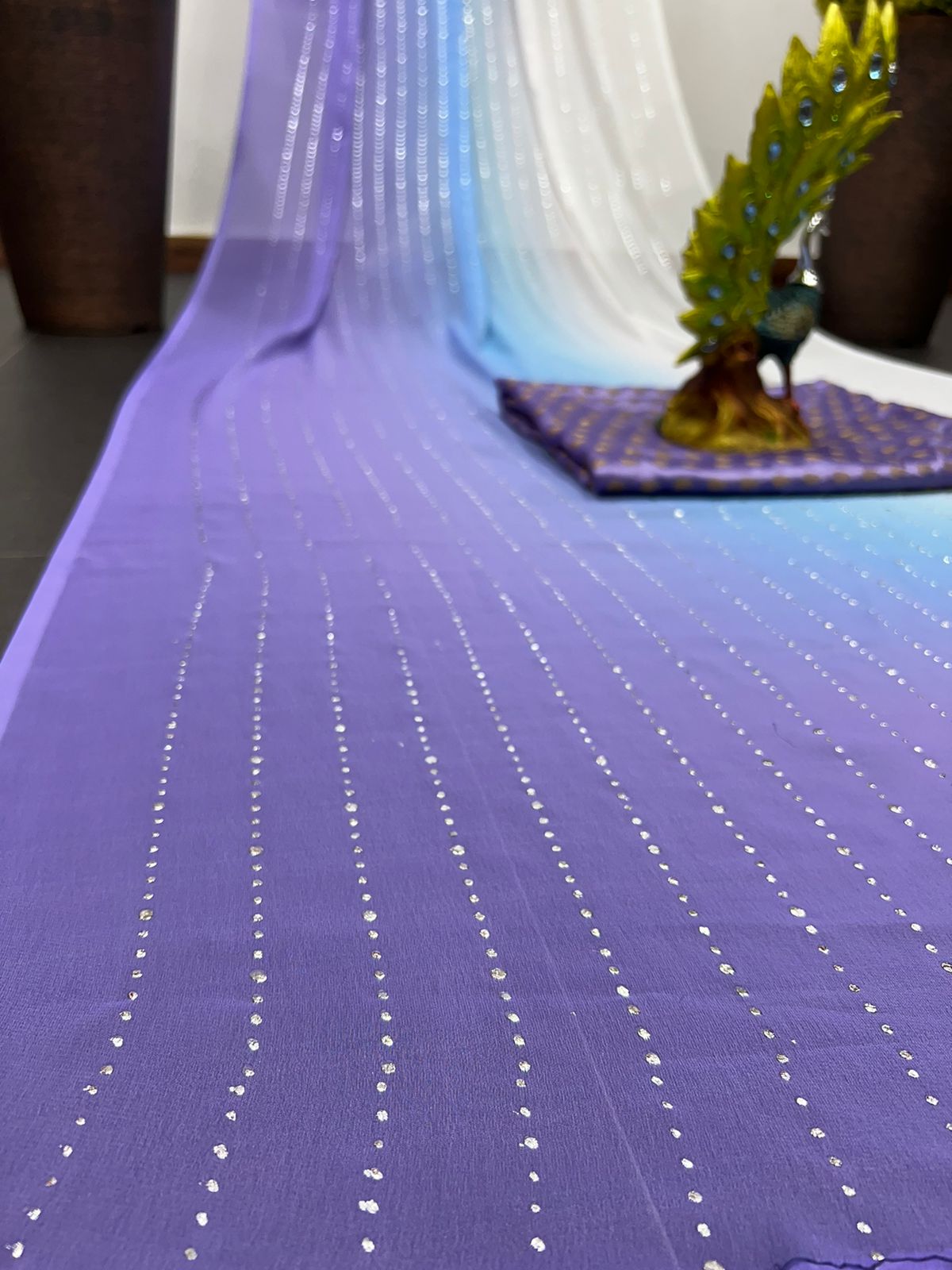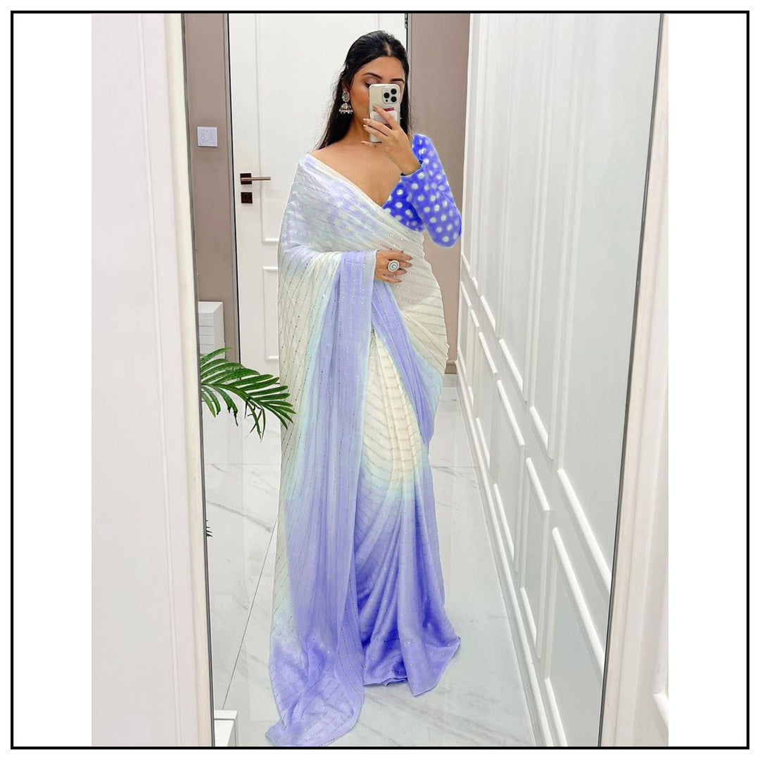 White and blue shaded georgette mukesh work designer saree