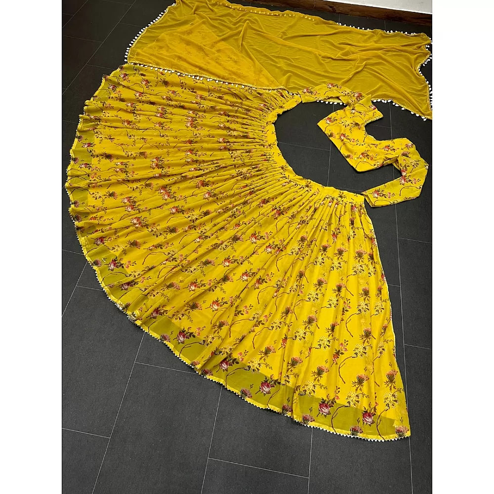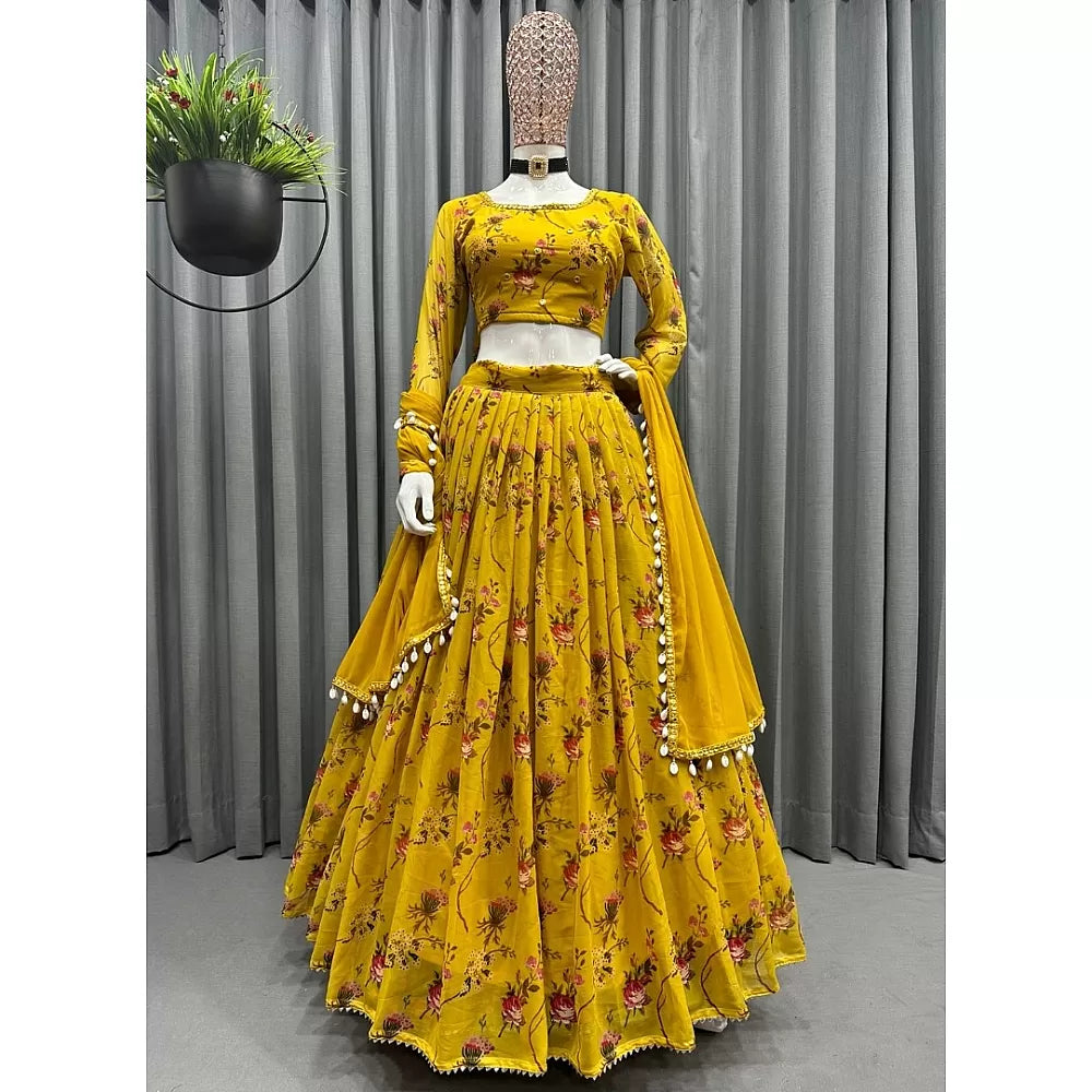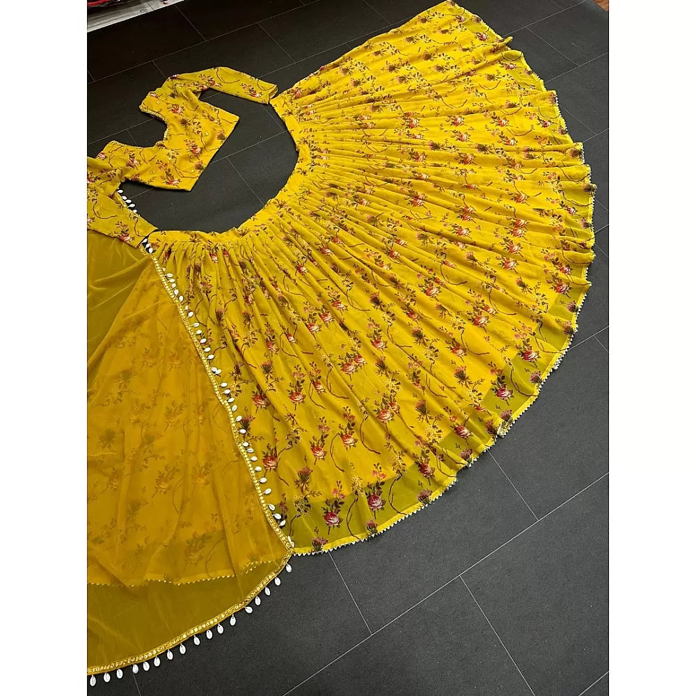 Yellow flower printed georgette lehenga choli for haldi ceremony