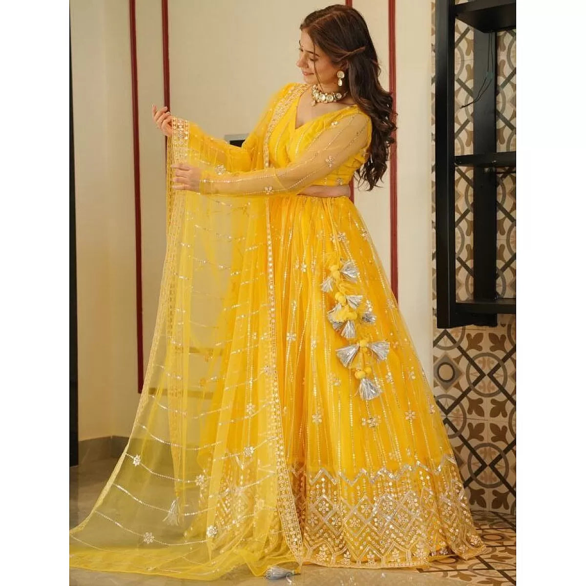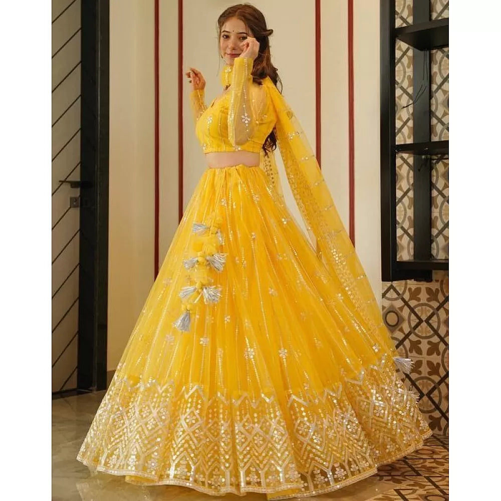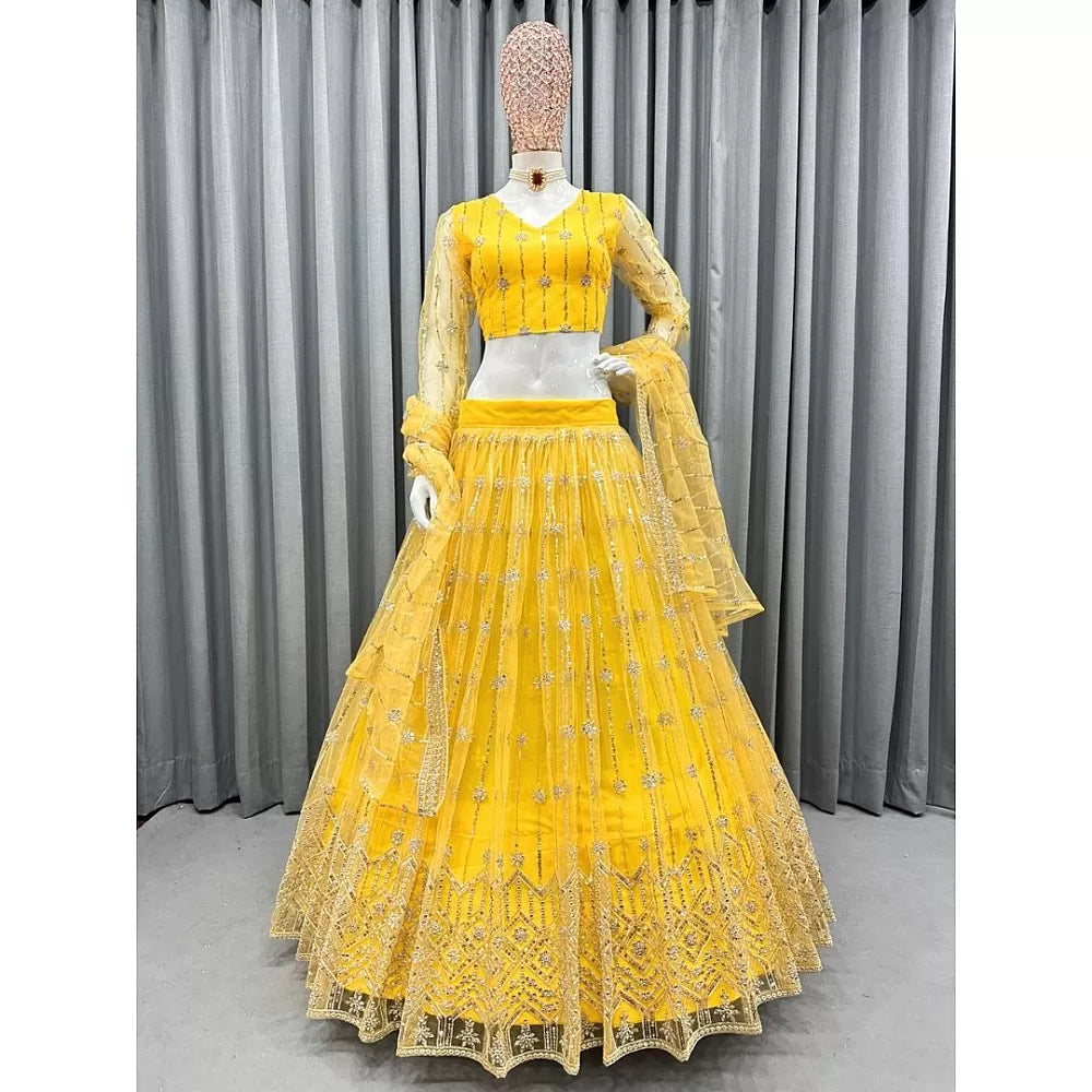Yellow soft net sequence embroidery work haldi ceremony lehenga choli